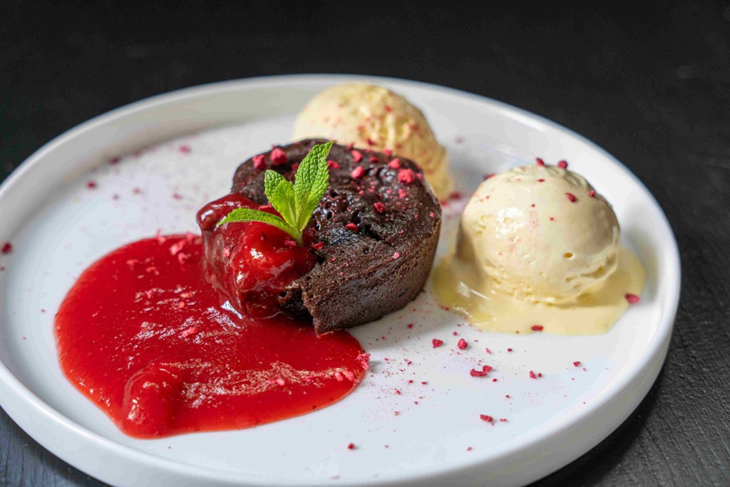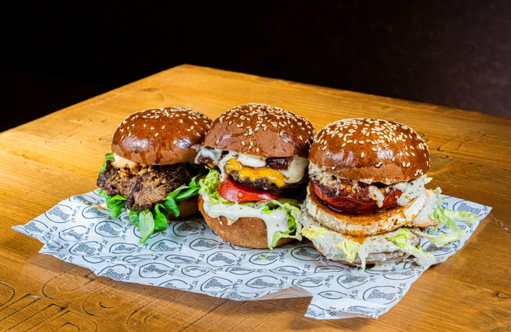 marhahúspogácsa, unami majonéz matcha teával, gombakrém, bacon, pirított hagyma, római saláta