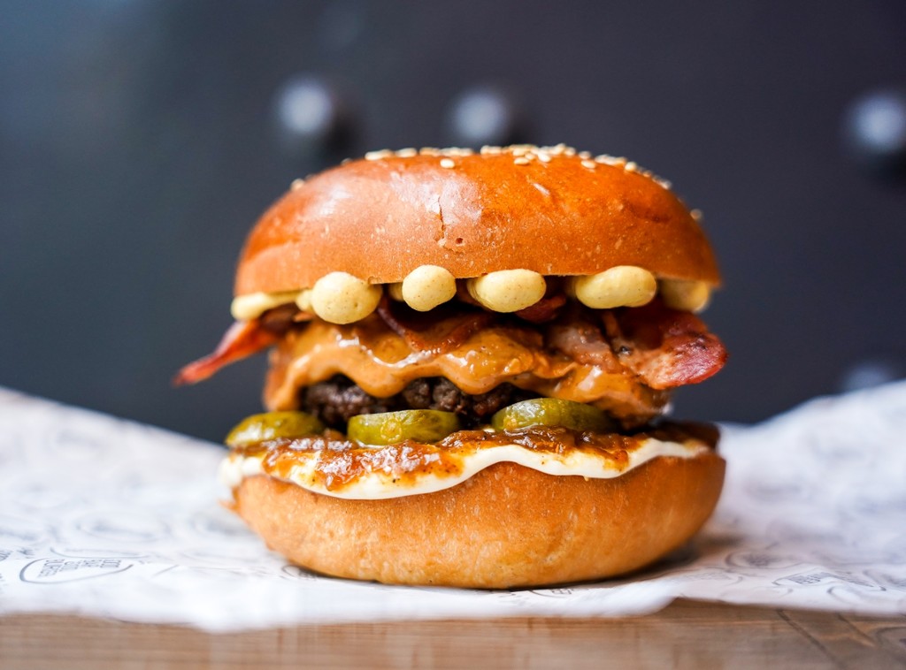 marhahúspogácsa, cheddar sajt, Monterey Jack sajt, bacon, füstölt mozzarella, pirított hagyma, csemege uborka, burger szósz (ketchup, majo, hagyma, cs. uborka)