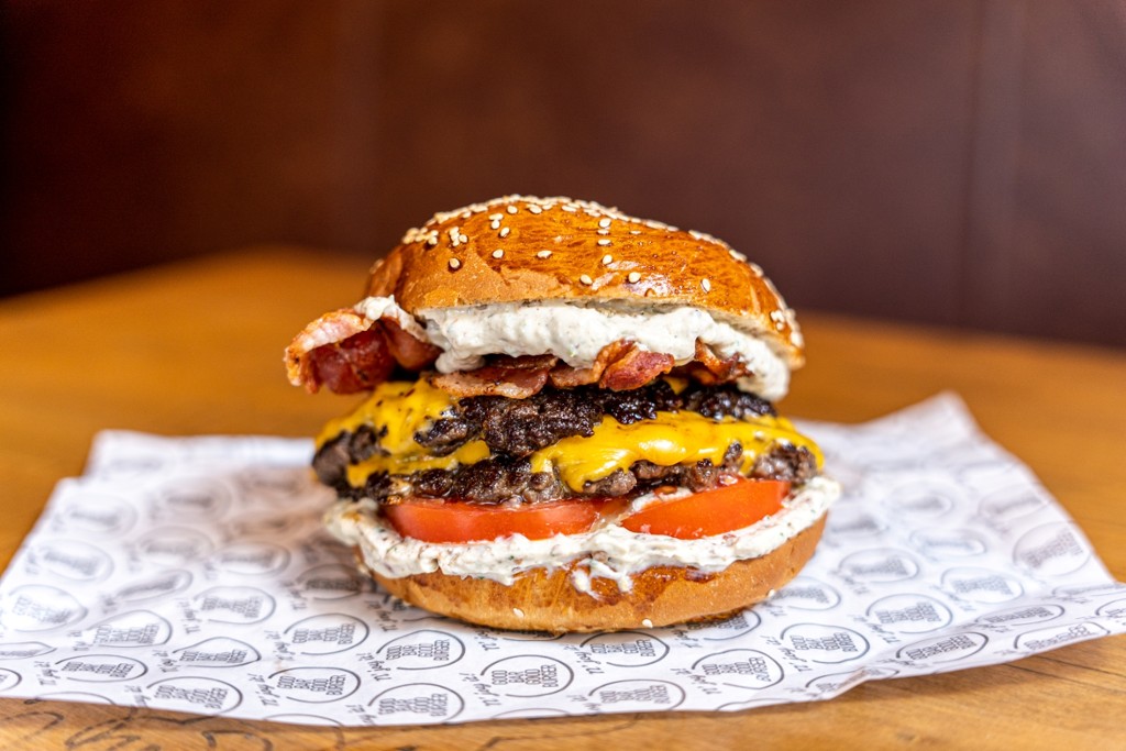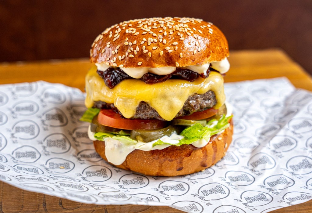 dupla marhahúspogácsa (2x150g), dupla sajt, GB szósz, hagymalekvár, csemege uborka, paradicsom, saláta levél