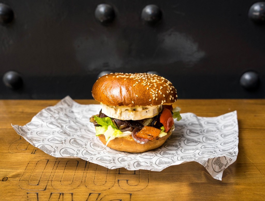 húsmentes hús, sajt, GB szósz, hagymalekvár, csemege uborka, paradicsom, salátalevél