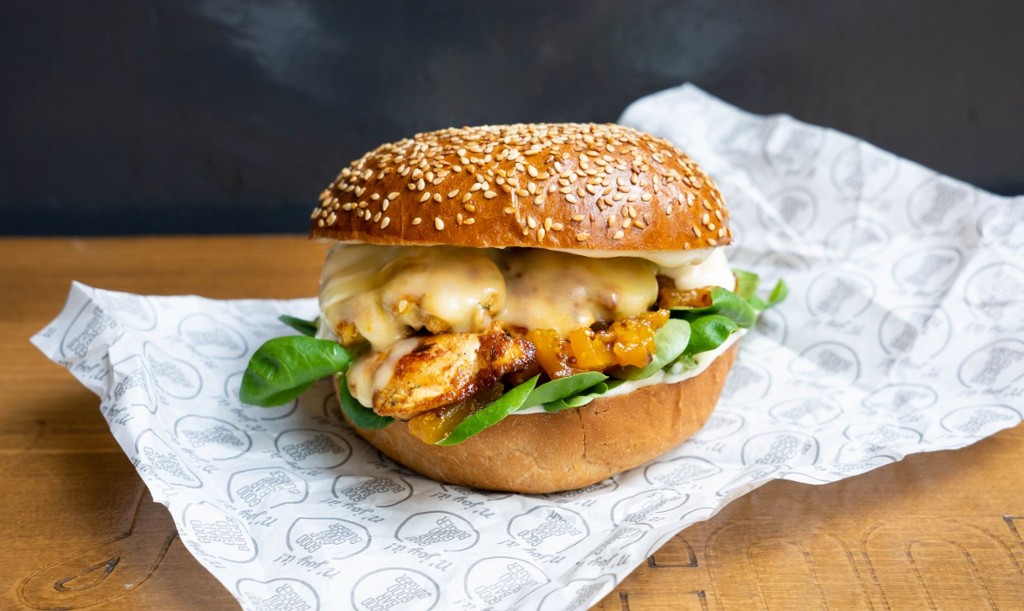 rózsaszín buci, angus marhahúspogácsa, camembert sajt, curry&mangó szósz, mézes bacon, saláta
