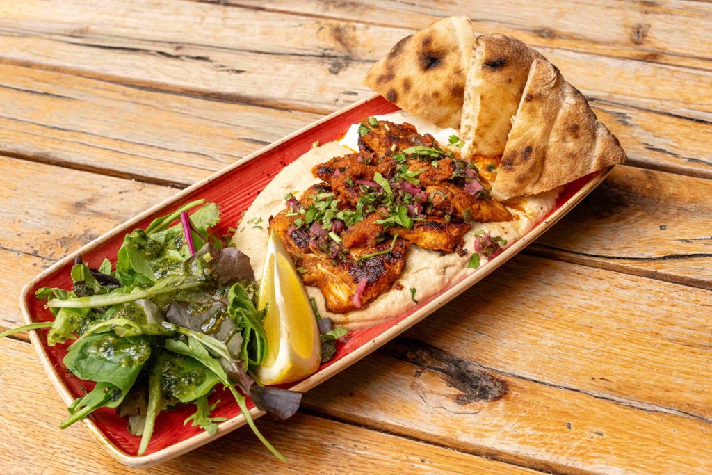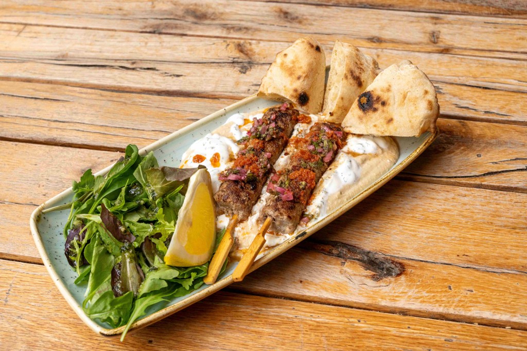 bárány kebab, hummusz, mentás joghurt, chimichurri (nem csípős), pita, mandulás pestos saláta