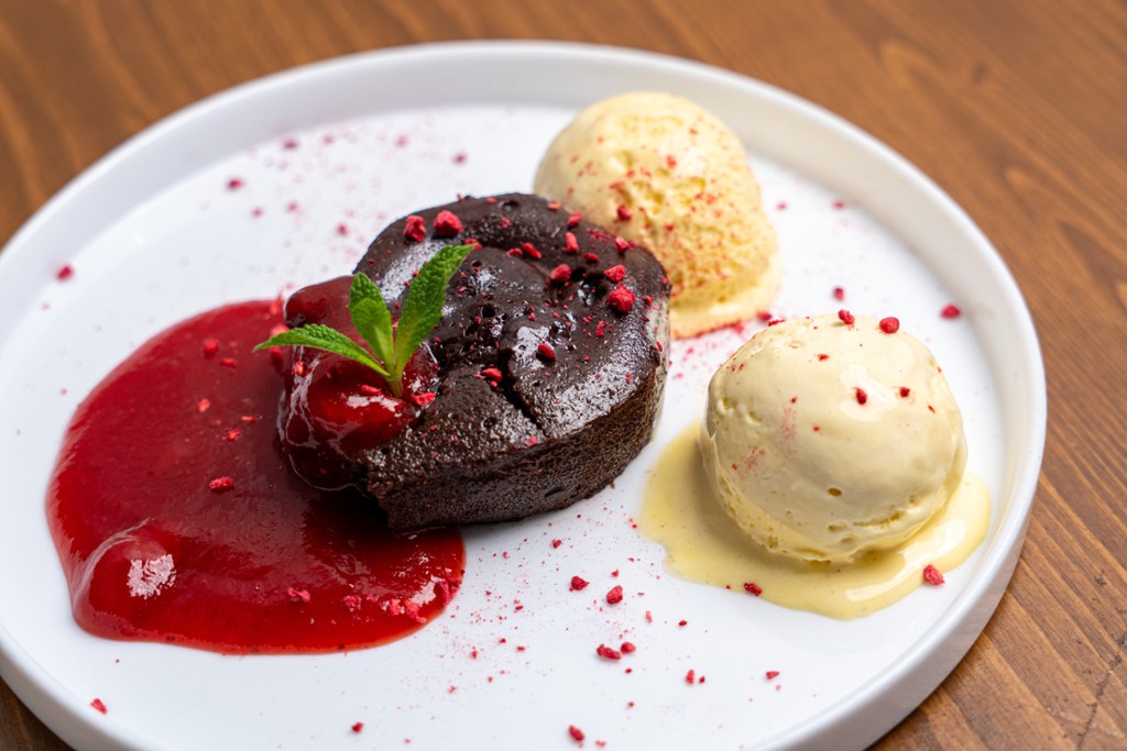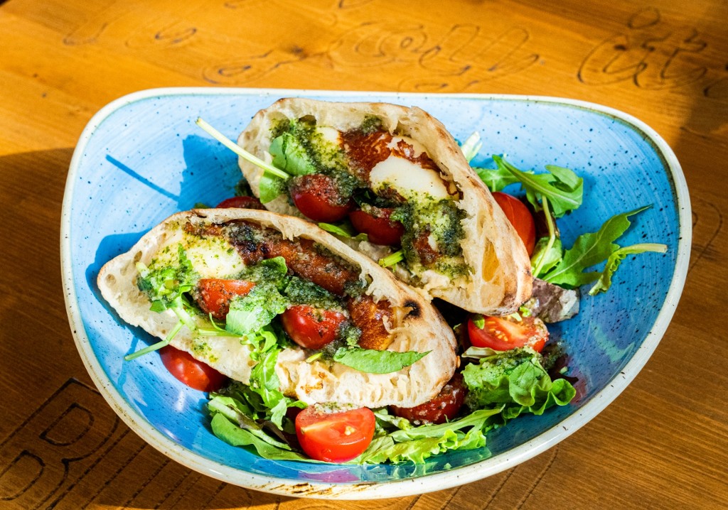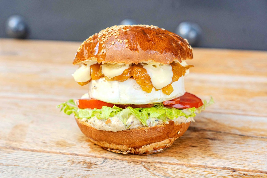 grillezett camembert sajt, padlizsánkrém, barack chutney Shanky's likőrrel, saláta, fokhagymás majonéz, paradicsom