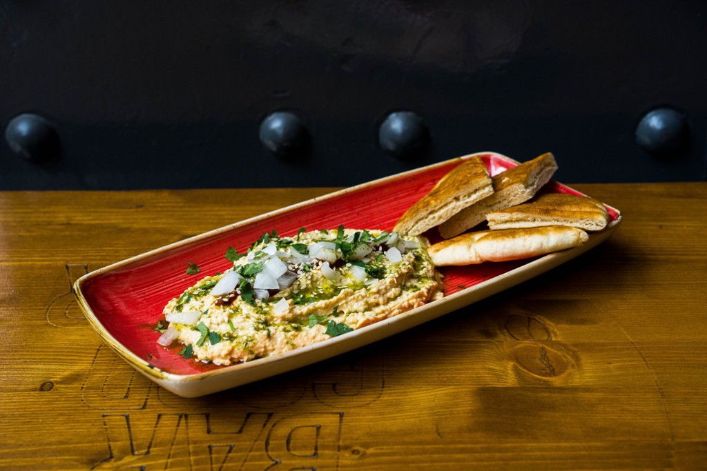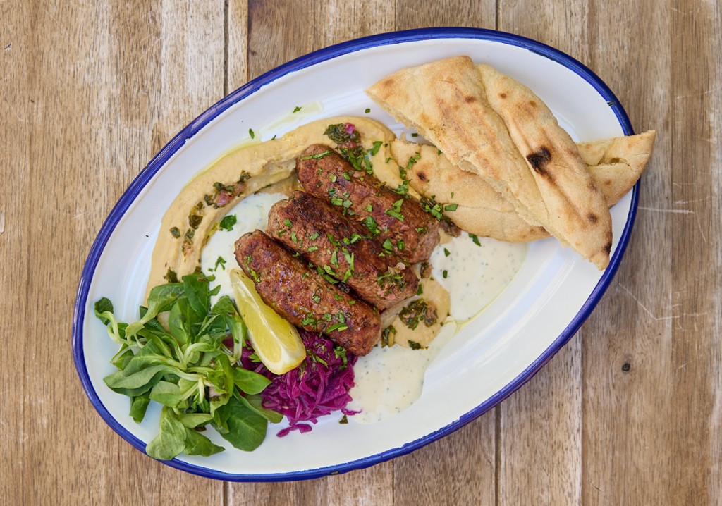 bárány kebab, humusz, mentás joghurt, lilakáposzta, chimichurri, paradicsom, pita/