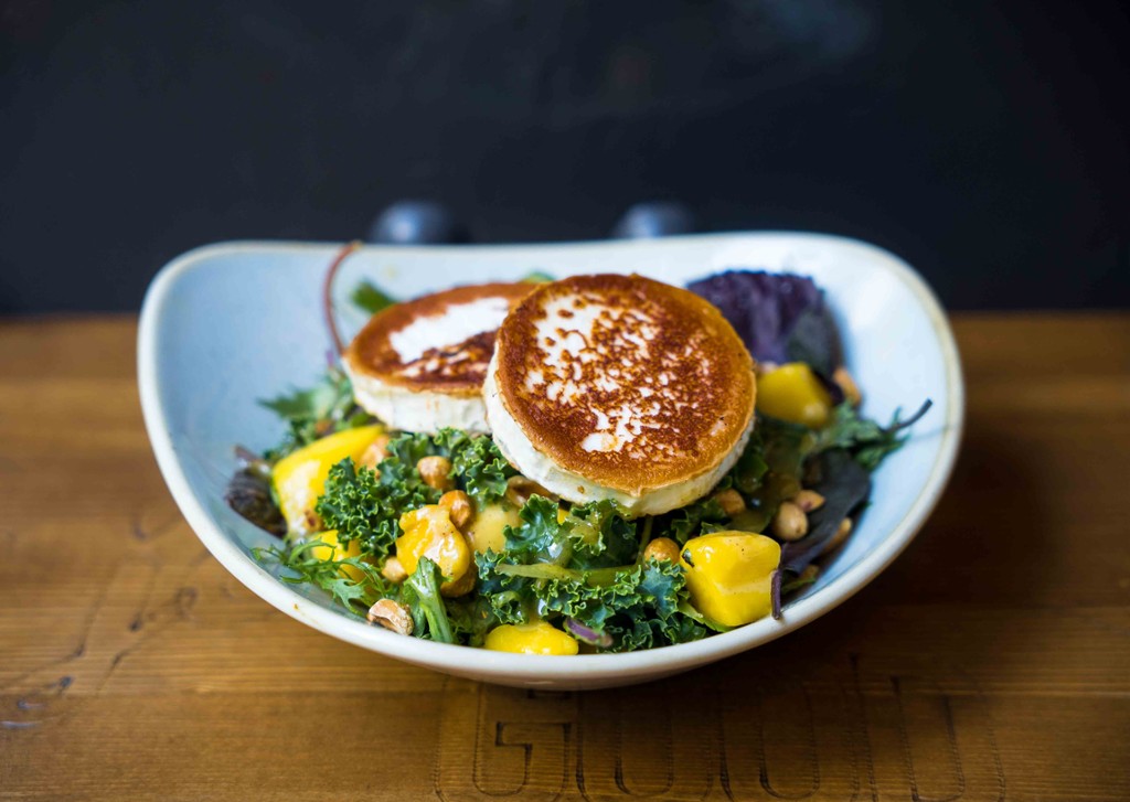 cheddar sajtkéreg, csicseriborsó fasírt, saláta mix, paradicsom, Monterey Jack sajt, padlizsánkrém, spenótos tortilla/falafel, salad mix, tomato, cheddar, Monterey Jack cheese, eggplant cream, spinach tortilla