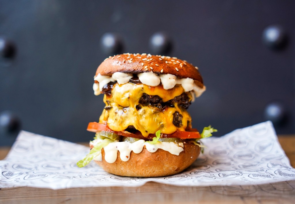 dupla marhahúspogácsa (2x150g), dupla sajt, GB szósz, hagymalekvár, csemege uborka, paradicsom, saláta levél