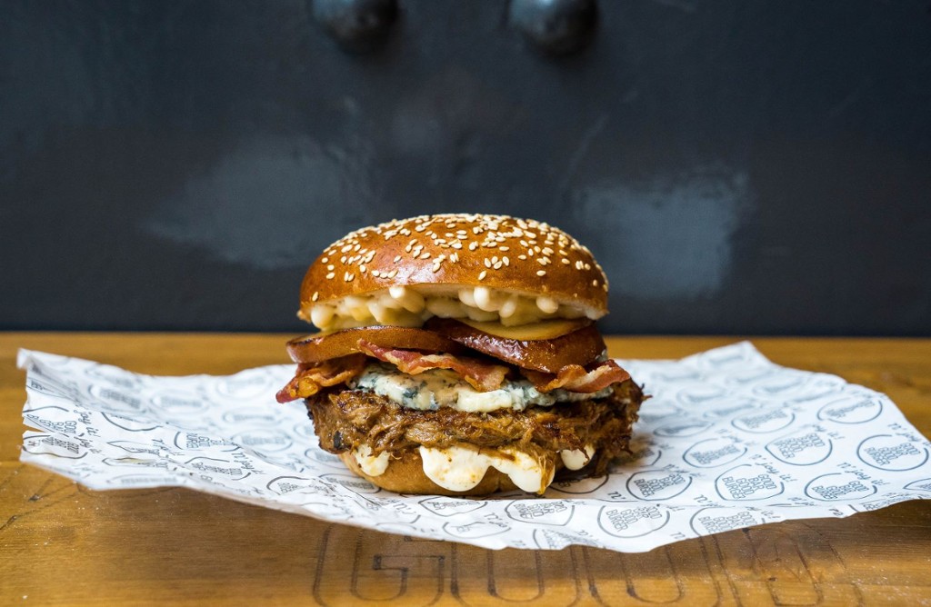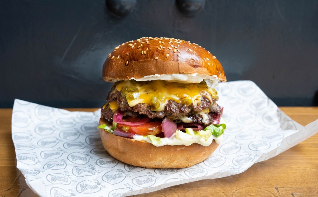 dupla marhahús cheddar sajttal és jalapenoval, füstölt chipotle paprika, paradicsom, habanero majonéz, római saláta, mascarpone, kólában pácolt hagyma