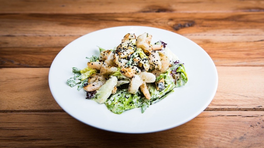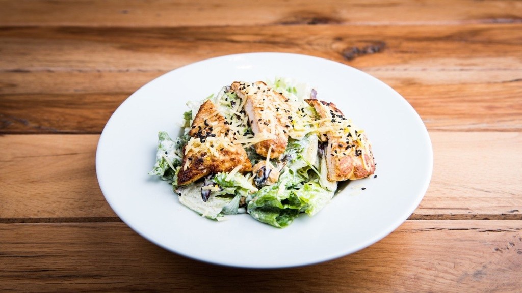 "cheddar sajtkéreg, grillezett csirkemell, saláta mix, paradicsom, Monterey Jack sajt, avokádós tejfölös szósz/