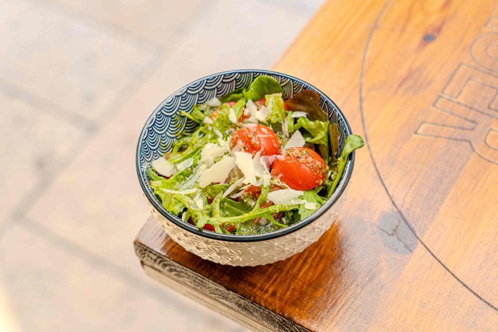 pitában sült füstölt mozzarella, saláta mix, mandulás pesto, koktél paradicsom, avokádós tejfölös szósz, humusz/grilled smoked mozzarella with pita, salad mix, almond pesto, cocktail tomatoes, sour cream sauce with avocado, hummus