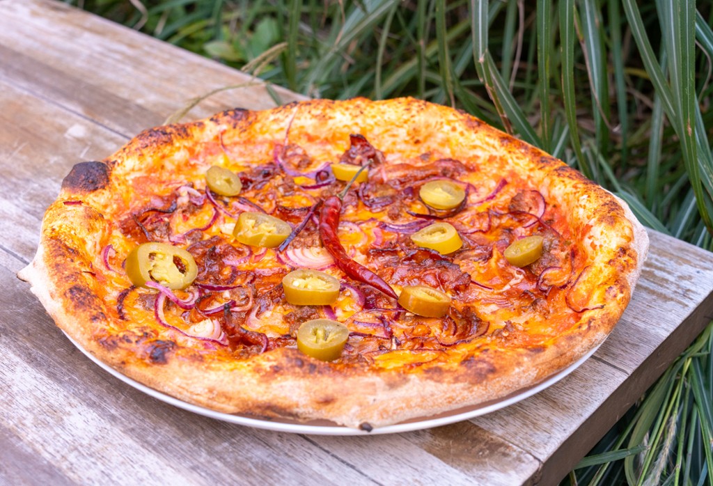 paradicsom szósz, fior di latte, ventricina szalámi, jalapeno/tomato sauce, fior di latte, ventricina salami, jalaepno