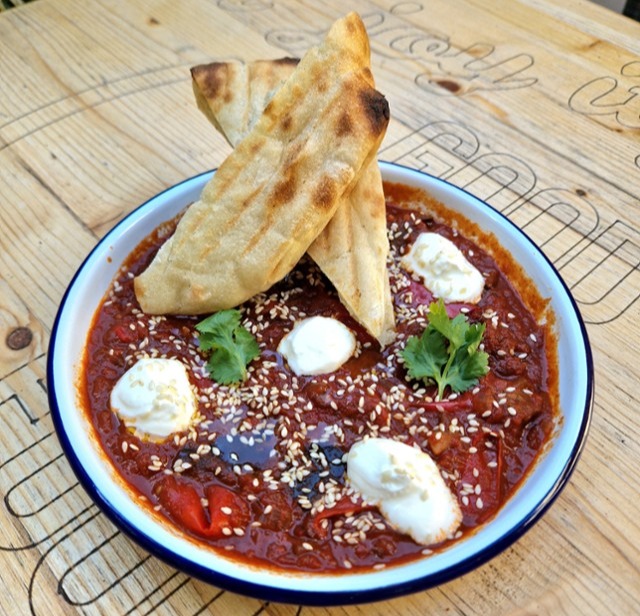Közel-keleti, fűszeres "lecsó" merguez (marha) kolbásszal, padlizsánnal, kápia paprikával, labneh-vel/Middle Eastern-style spiced ratatouille with eggplant, merguez sausage (100% beef), kapia peppers, and labneh
